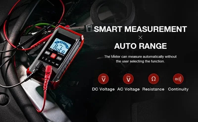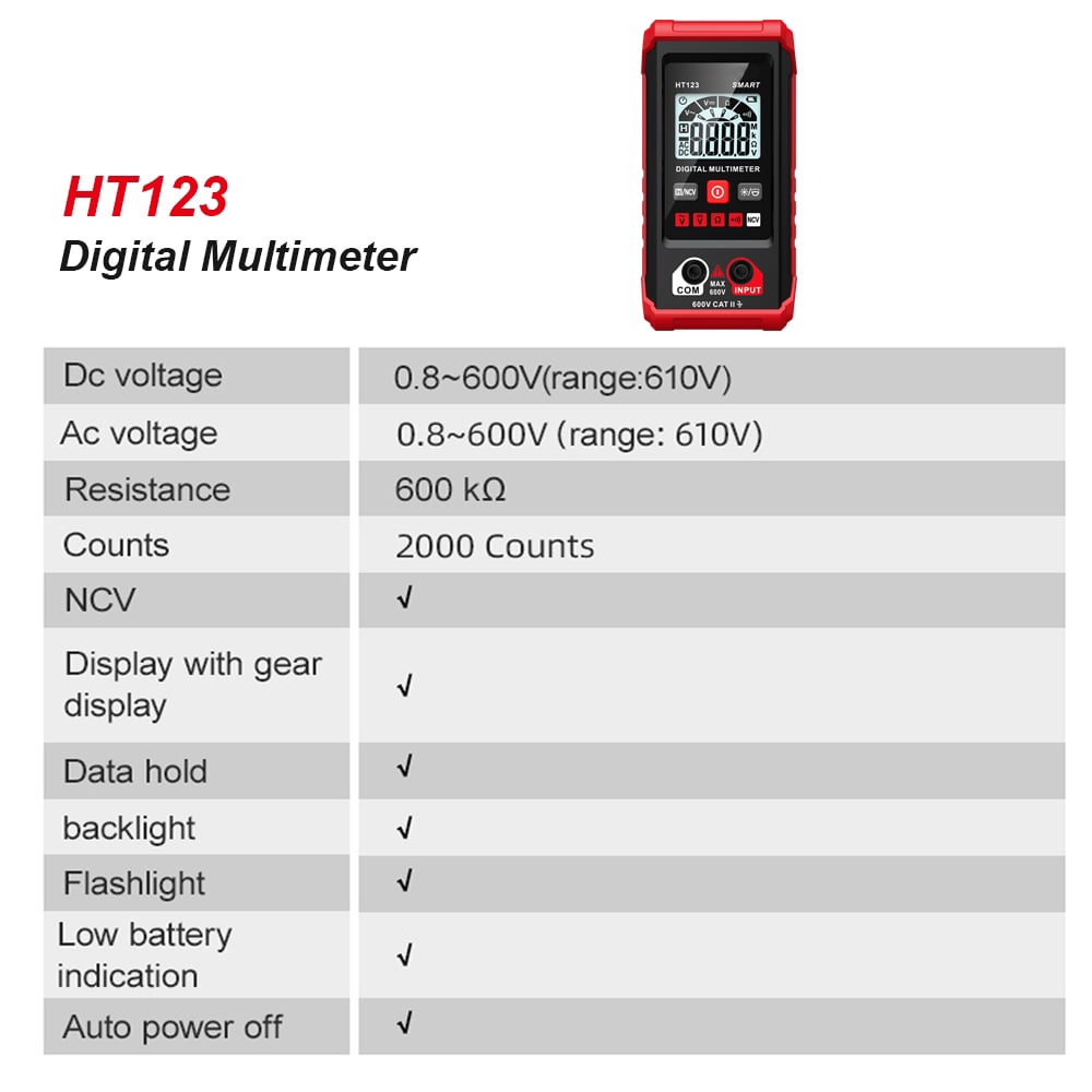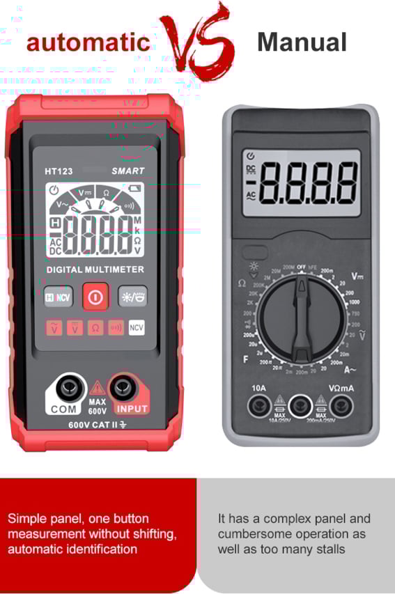 Smart Digital Multimeter: Thanks to its Smart Auto Mode, Our HT-123 counts smart digital multimeter allows you to quickly switch between all measurement tasks, including AC/DC voltage, resistance.and continuity, without selecting a mode or range. lt makes measuring work easy, fast, and accurate.